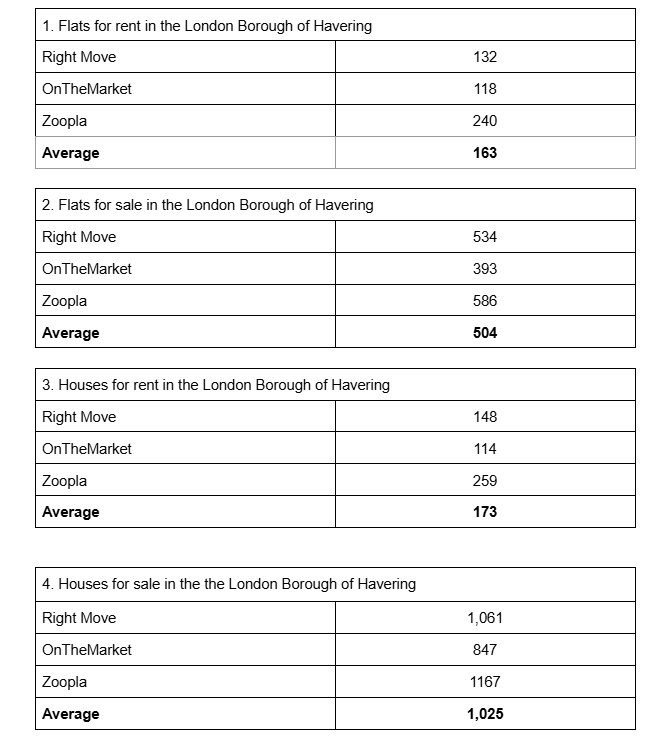So let’s take a look at the actual properties listed for sale and rent in the London Borough of Havering. For this exercise we’ve used four terms in a our search parameters:
